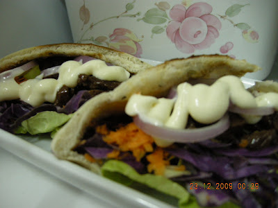 Dah bekpes ke??? Jom kite makan pita bread with beef teriyaki.... huhuhu... Sebenarnya buat ni masa tengah malam tadi... Apehal le tgh2 malam buat??? Wakaka... ni kes kebuluran... kengkonon nak study... siap dah tido siap2... lepas tu bangun...Bila tengah2 study dan main facebook... lapar le pulak... ape lagi... terus skodeng dapur...